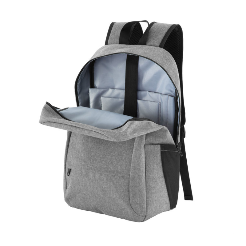 Mochila urbana portanotebook de hasta 16 pulgadas. Compartimento principal con cierre y bolsillo portanotebook y tablet de hasta 11 pulgadas, además bolsillos organizadores de accesorios. Compartimento frontal con 2 bolsillos delanteros. 2 bolsillos laterales, mitad de tela y mitad de malla elástica. Asa color negro. Interior forrado el poliéster gris claro. Correas ajustables y espalda acolchadas. Tira para sujetar la mochila en la manija extensible de un equipaje de mano. Tiradores de cierre metálicos.